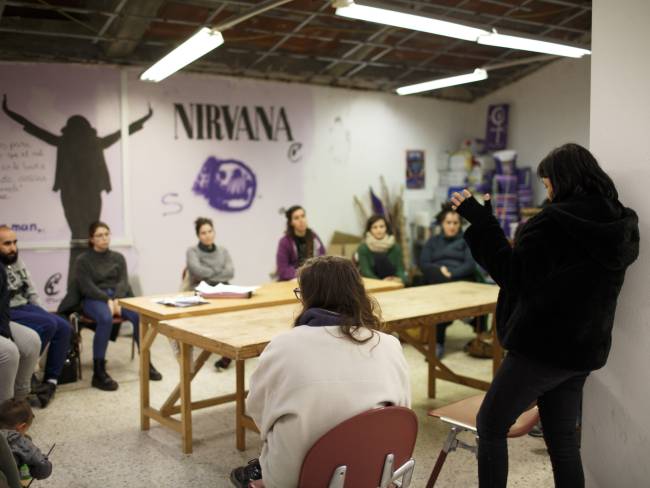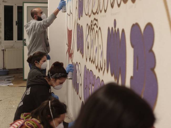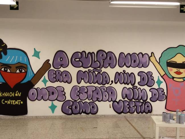 Na segunda xornada do taller, as participantes avanzaron na aproximación ás técnicas da arte urbana a través do emprego de spray. En base ás temáticas sobre as que xirou tanto a conversa colectiva como as creacións realizadas durante o tempo compartido coas persoas inscritas no obradoiro, Vegan Bunnies realizou o bocexo dun graffiti de mediano tamaño nunha das paredes interiores da Casa do Matadoiro. De forma colaborativa, as participantes encargáronse de finalizar e perfeccionar os trazos das figuras e do texto da composición, así como de darlle cor. O resultado é un mural que emula a performance colectiva iniciada en Chile polo colectivo “Las Tesis” para denunciar a violencia estrutural do patriarcado sobre as mulleres.
